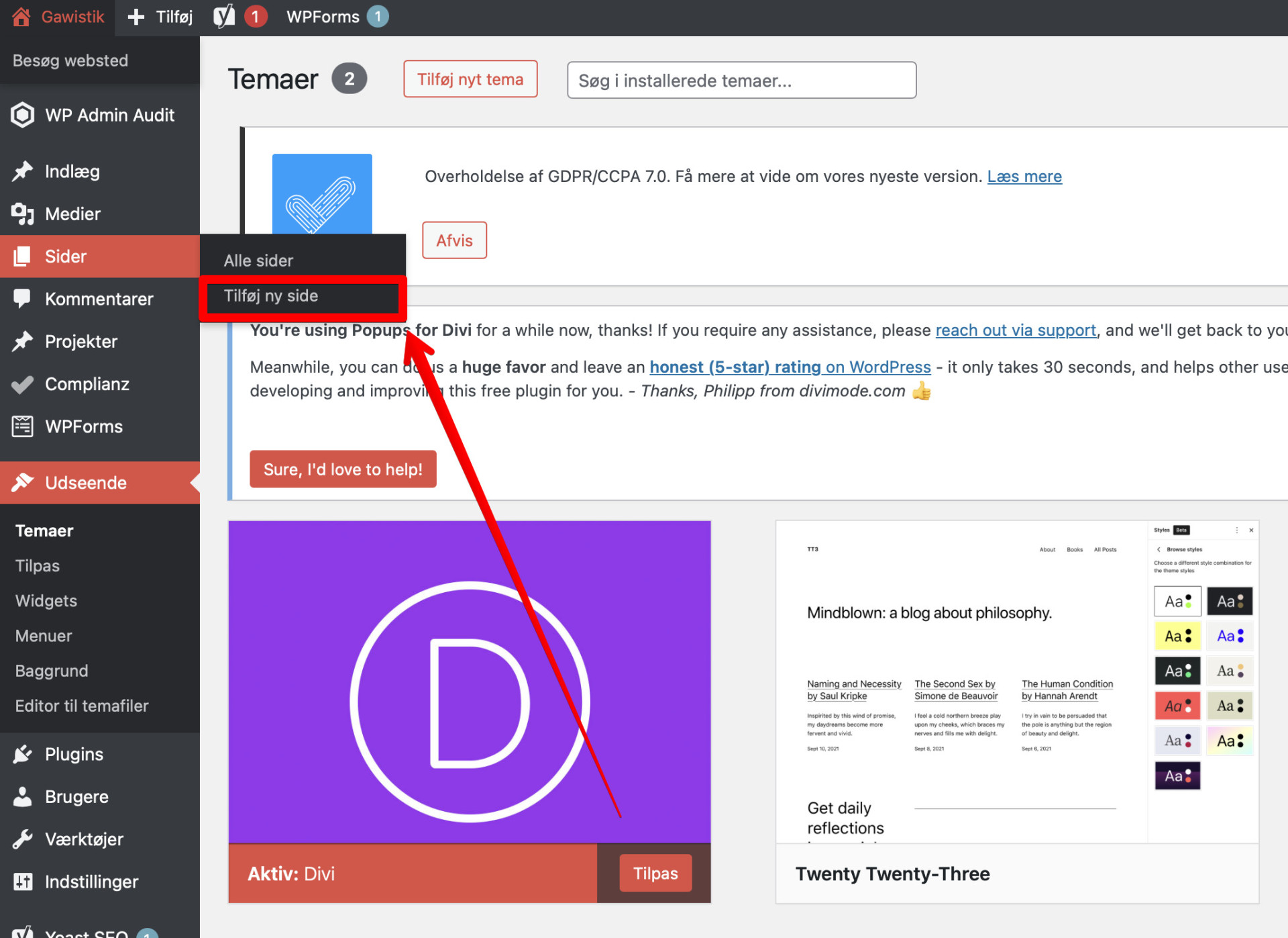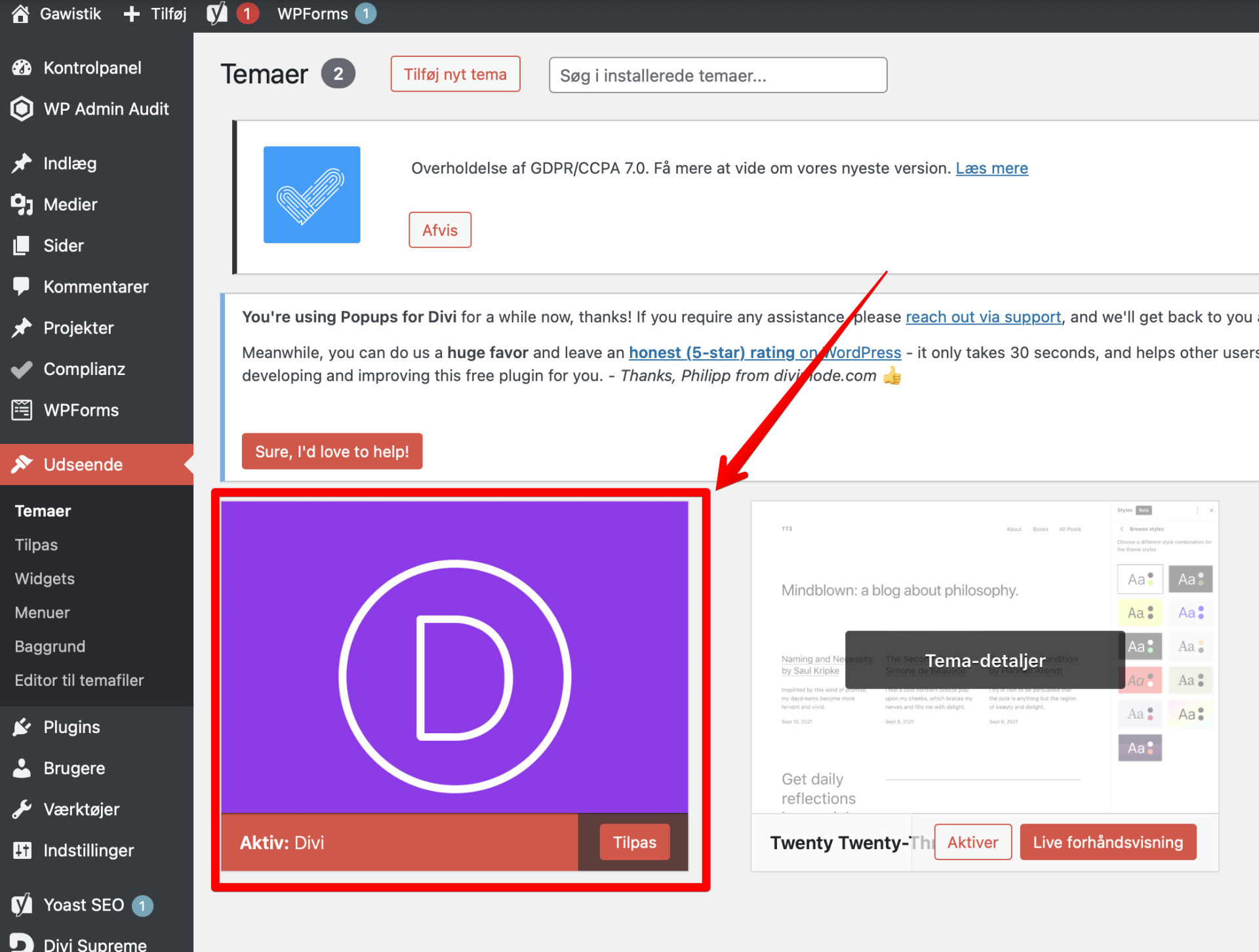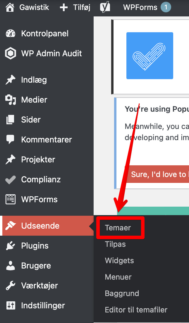 Lad os starte med at tjekke at Divi er aktiveret på dit website, tryk på “Udseende” på din hjemmeside og vælg “Temaer”
