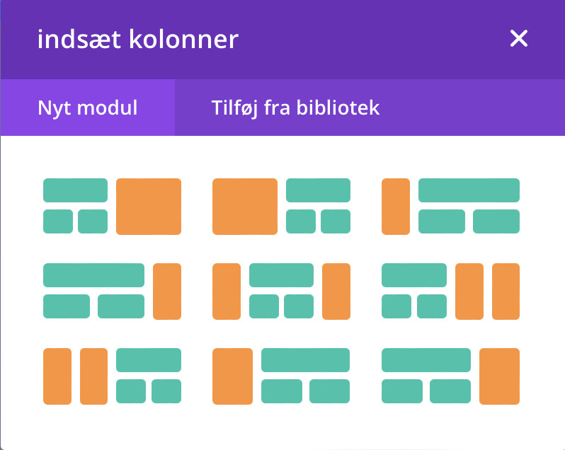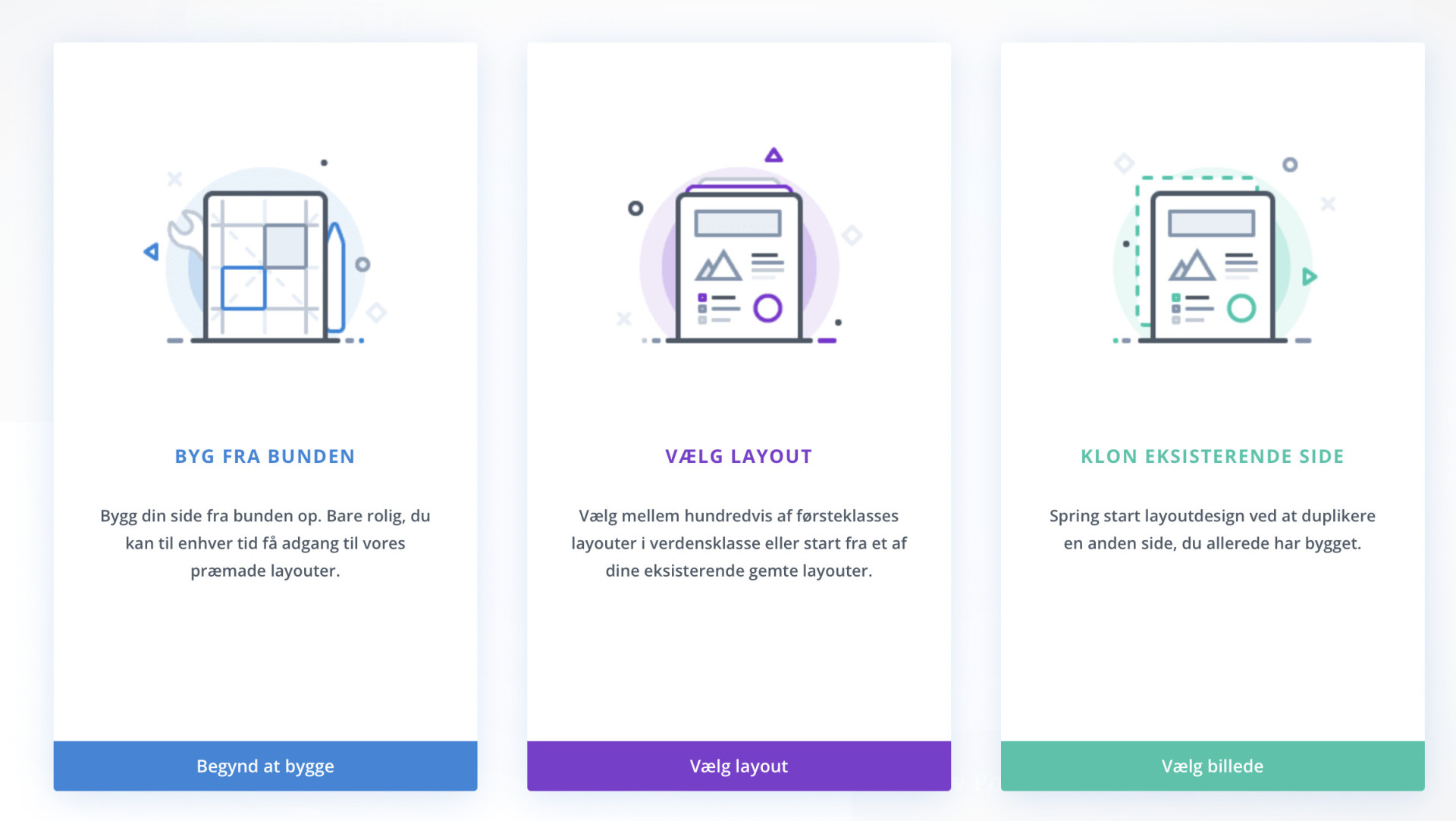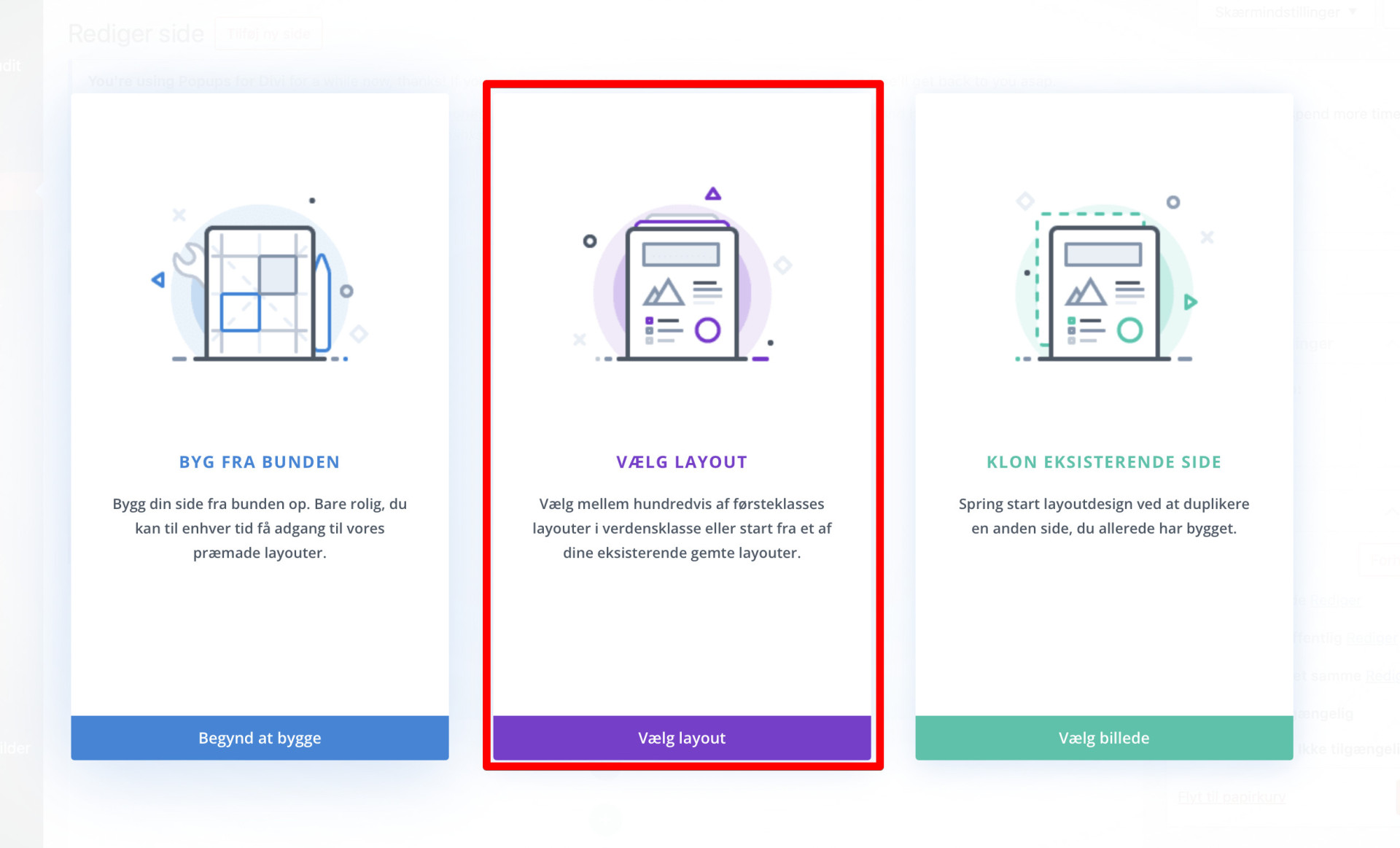 I dette afsnit tager vi udgangspunkt i at bygge din side med et layout. Så tryk på den lilla knap hvor der står “Vælg layout”.