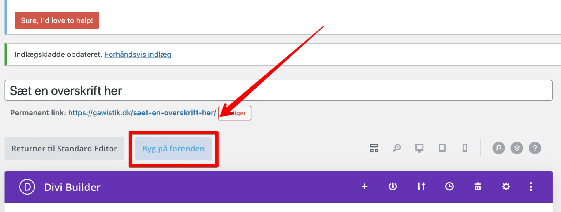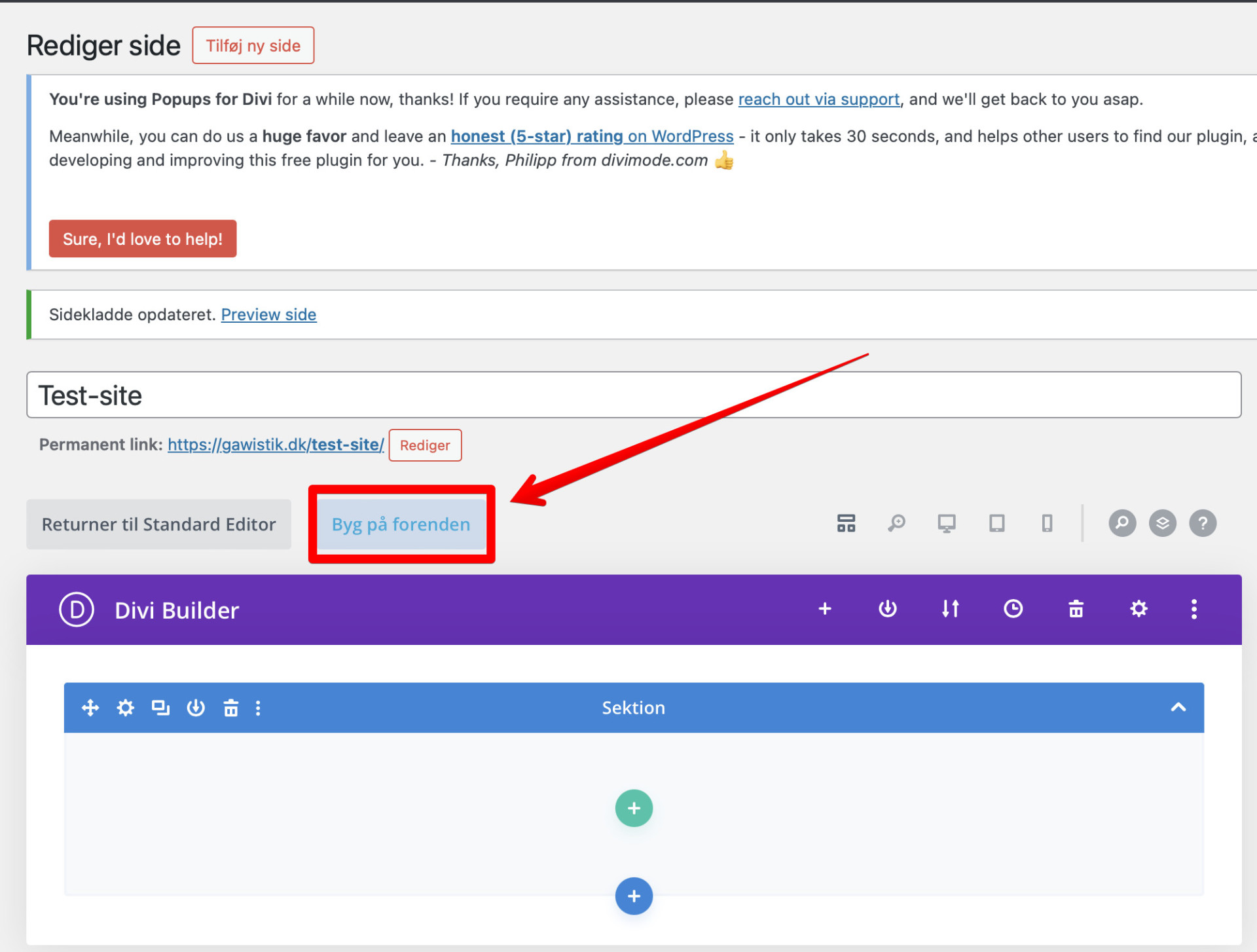 Herefter skal du trykke på “Byg på forenden”, dette er for at du kommer ind i Divi’s “Visual Builder”. Her kan du sidde og rykke rundt på dine forskellige elementer og skifte farve osv, imens du kan se, hvordan det ser ud for slutbrugeren.