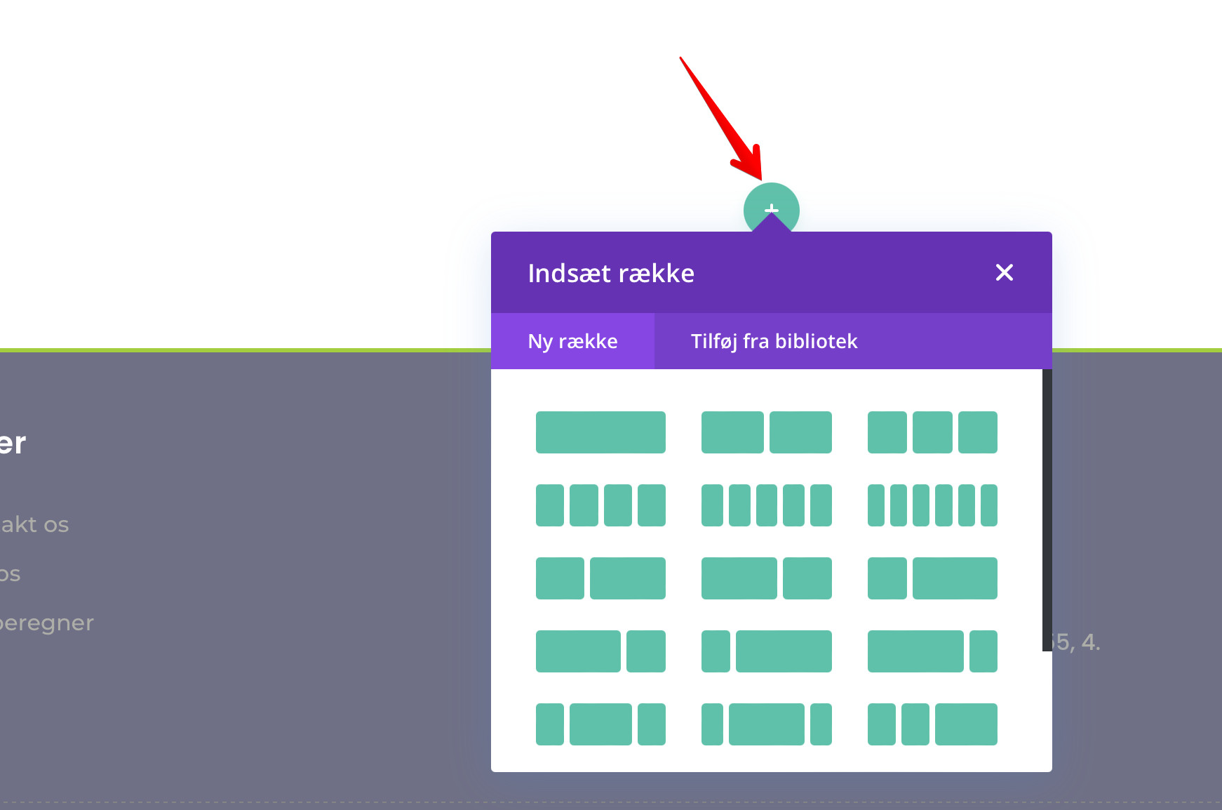 Tryk herefter på den grønne knap for at indsætte en række, rækker er de “usynlige” kasser som du fx kan sætte tekstfelter eller billeder ind. I vores tilfælde vælger vi den, hvor der er 3 grønne kasser, som er lige store.