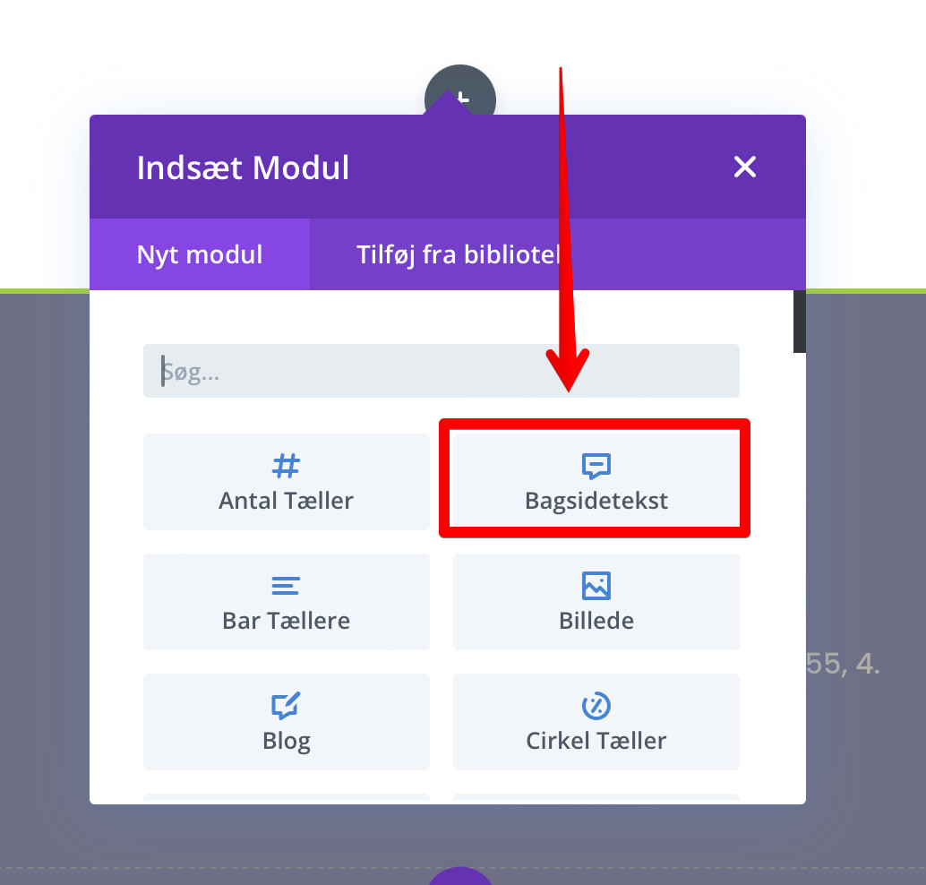Efter du har gjort det, kommer der en sort knap frem. Her kan du vælge imellem alle Divi’s forskellige moduler i vores eksempel bruger vi bagsidetekst.