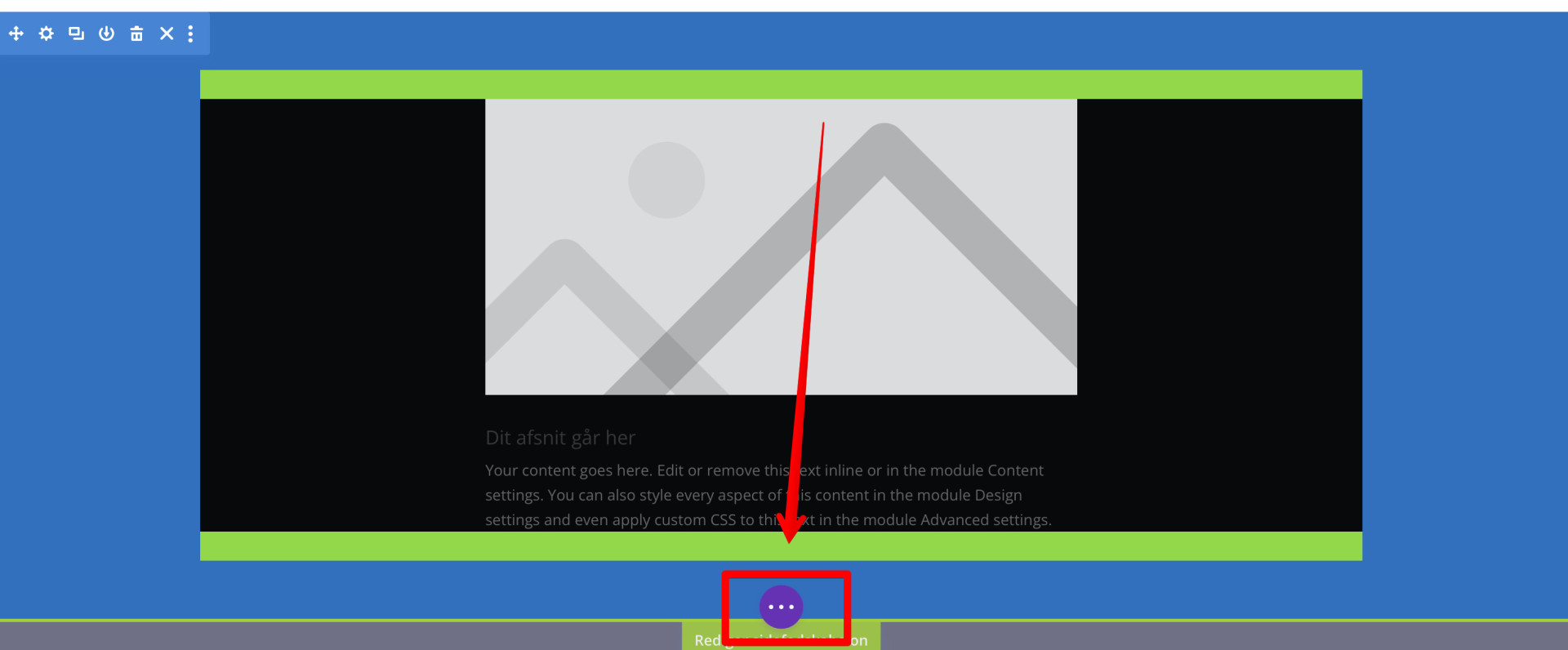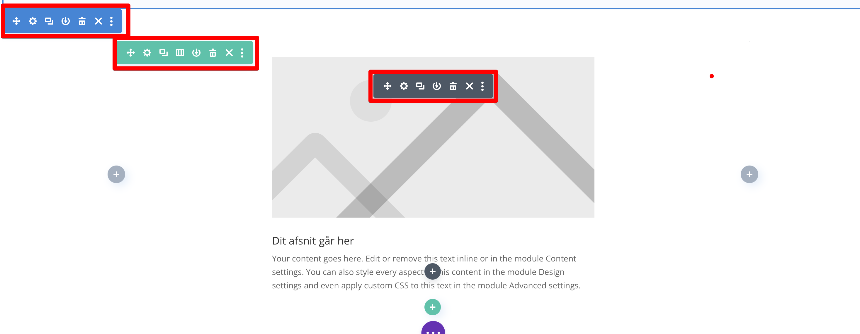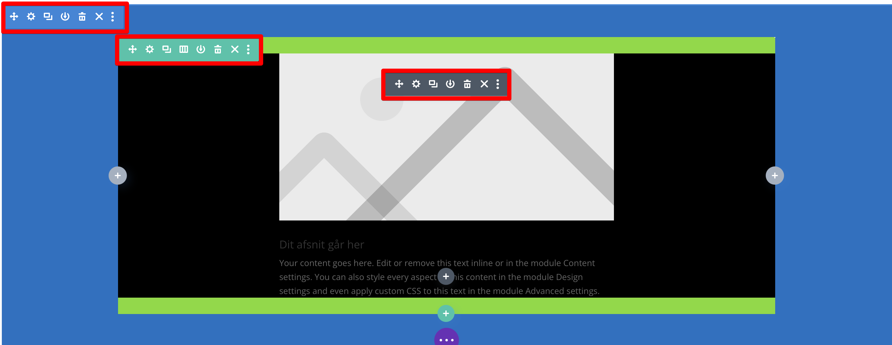 Jeg har her farvelagt sektionen, rækken og modulet så det er nemmere at se, hvad der hører til hvad. Så hvis du vil rette i baggrunden på det hele, skal du ændre på den blå, men hvis du skal rette i teksten eller billedet, skal du bruge det grå felt da billedet er et modul.