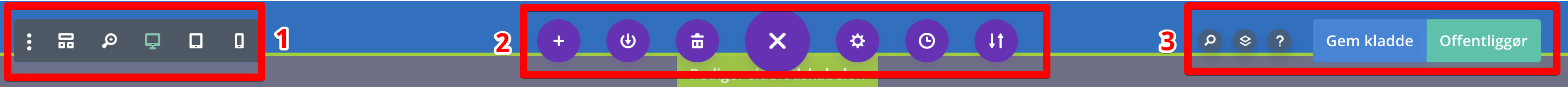 Hvis vi tager udgangspunkt i kassen nummereret 1, ser vi en del knapper, de vigtigste er den med computeren, tableten og telefonen. Hvis du trykker på disse ikoner, kan du se hvordan din hjemmeside fungerer på de forskellige enheder. De andre ikoner er mindre vigtige, men du kan stadig prøve at lege lidt med dem.