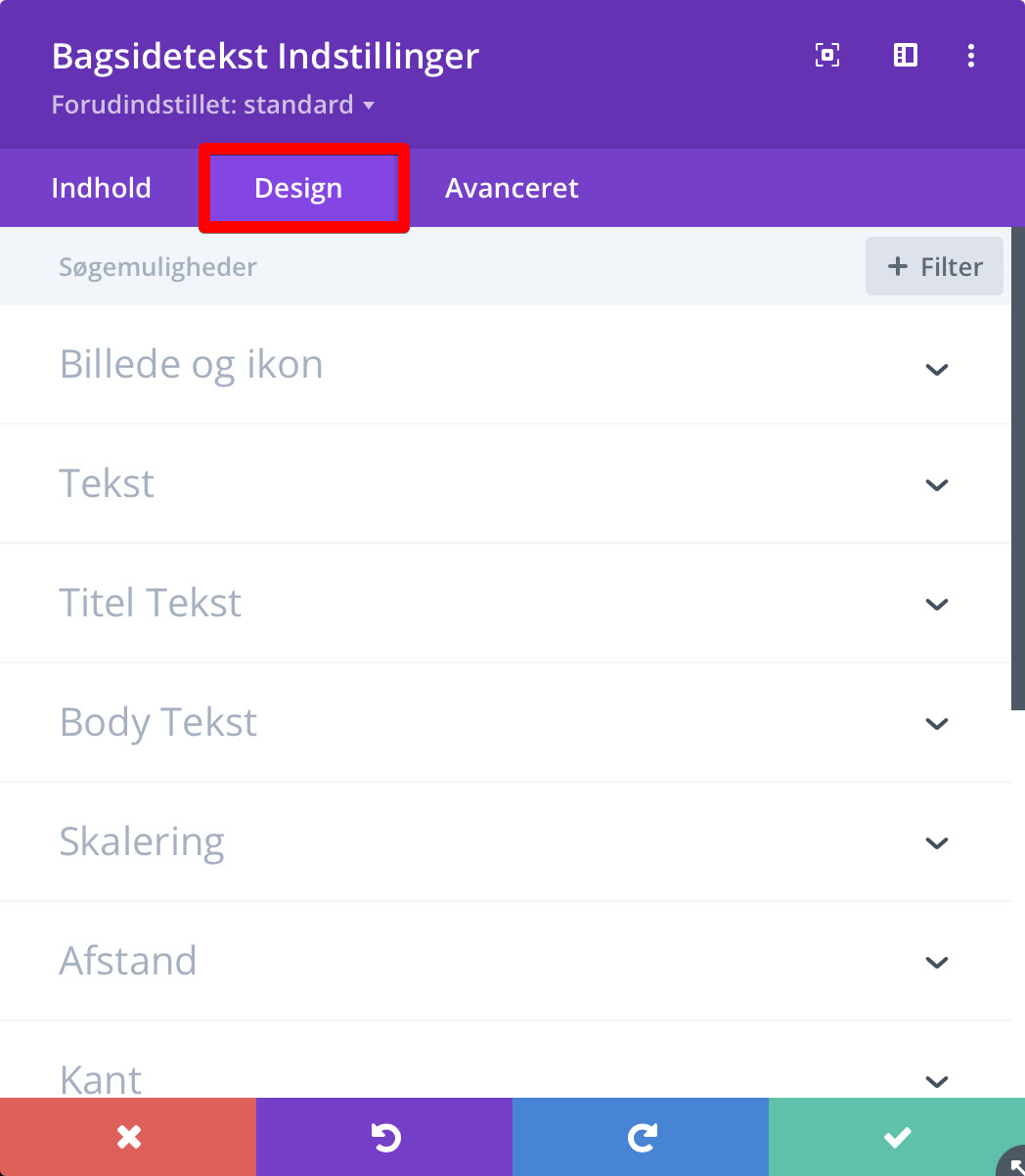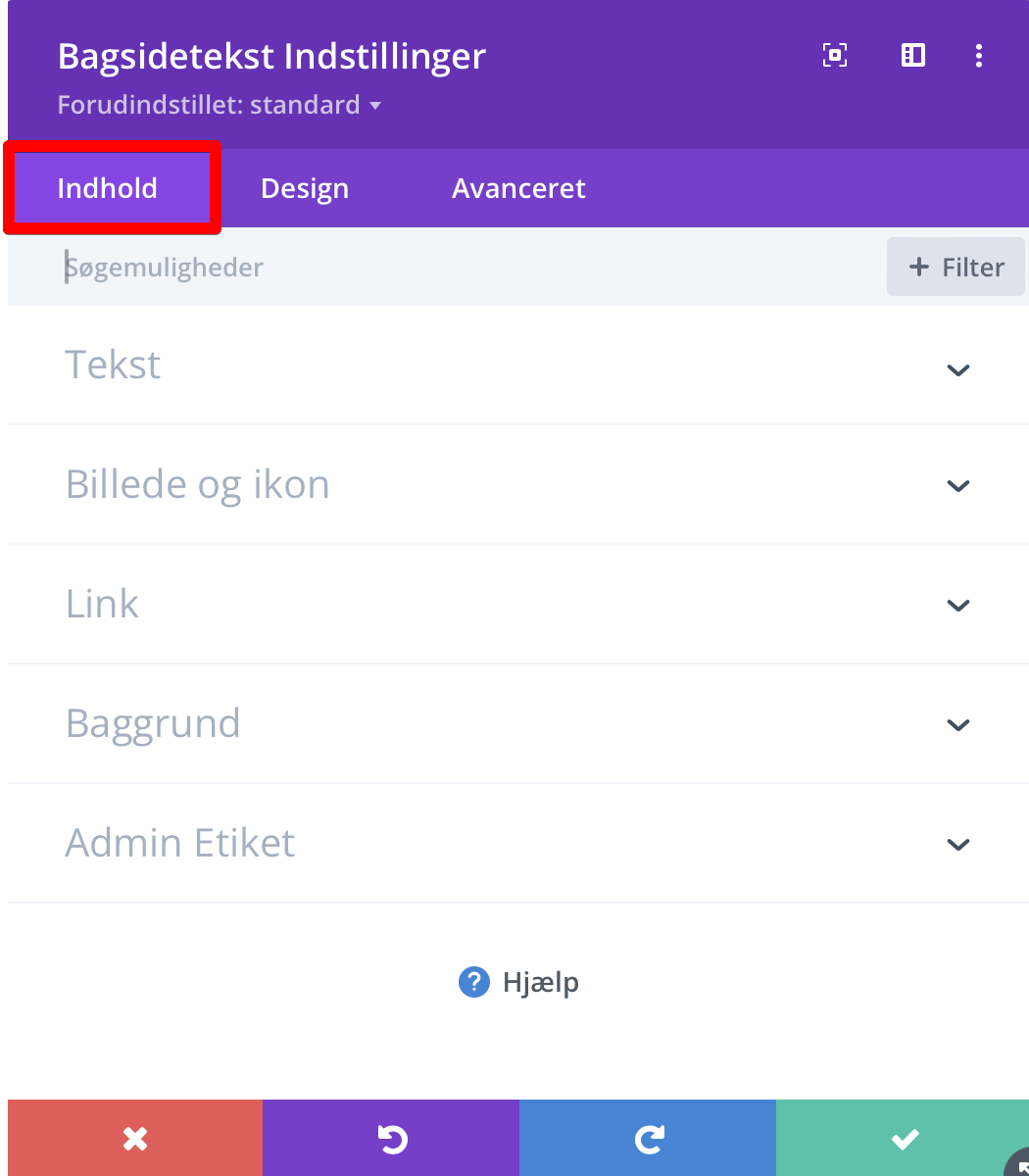 Hvis du trykker på tandhjulet vil du se følgende, de tre overordnede overskrifter “Indhold”, “Design” og “Avanceret”