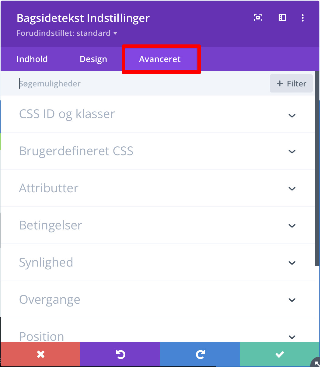 Hvis du nu klikker på: “Avanceret”, her er de vigtigste indstillinger “Synlighed”, “CSS ID og Klasser” og “Position”