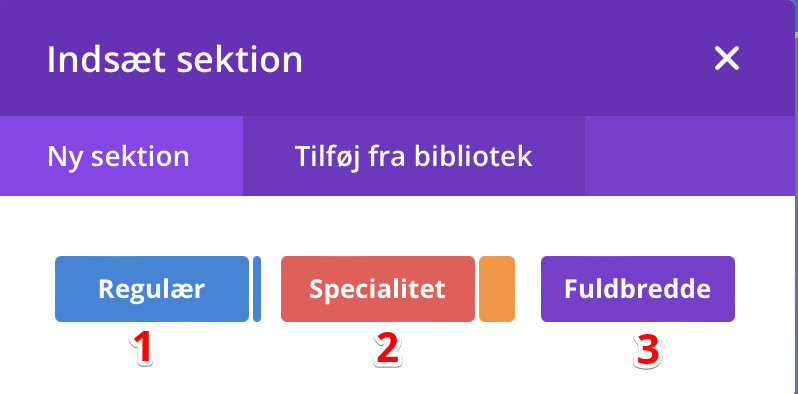 Når du trykker på det lille blå plus vil du se følgende muligheder. Den regulære sektion er den, vi har brugt som udgangspunkt i vores tidligere eksempler.