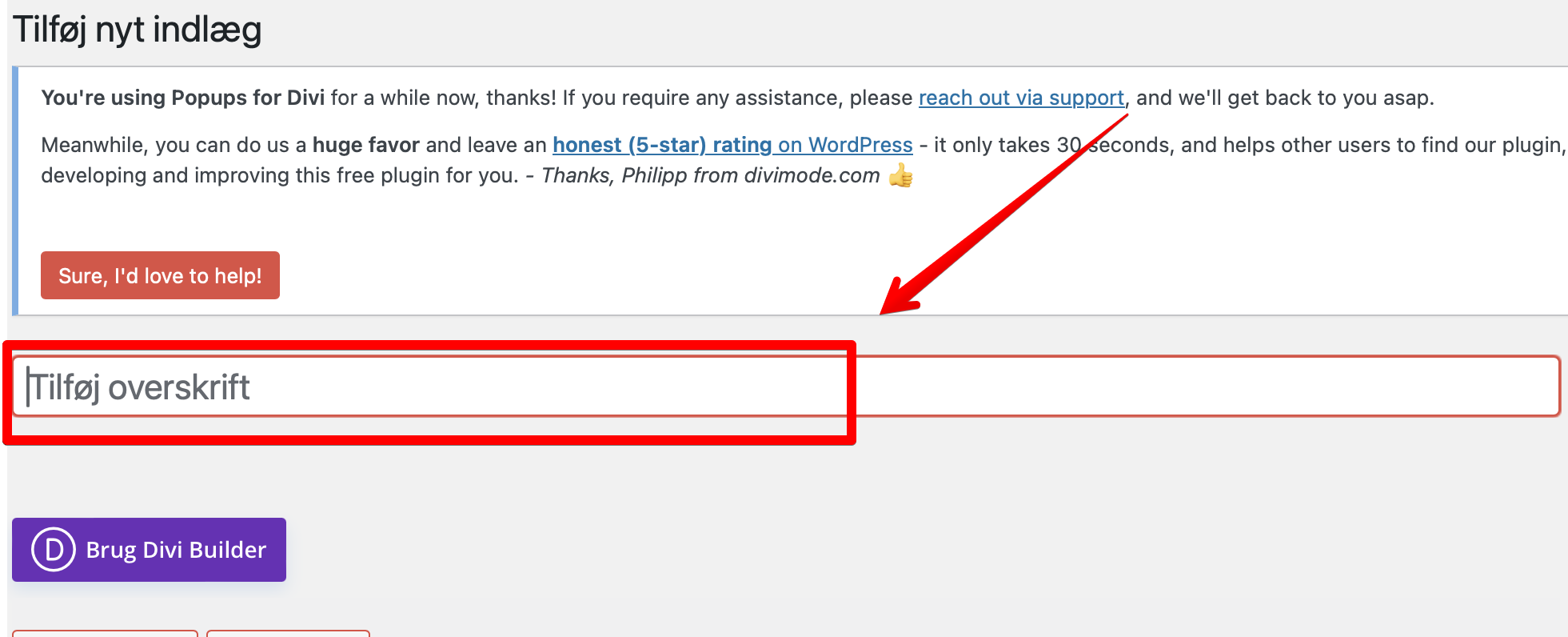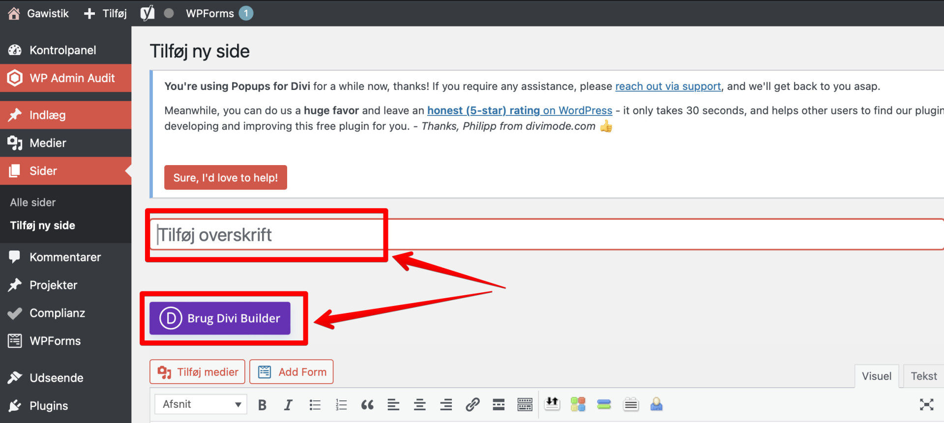Start med at give din side en overskrift, hvis det er din første side kan du fx kalde den “Hjem”, herefter trykker du “Brug Divi Builder”, for at åbne Divi, så du kan redigere i din nye side.