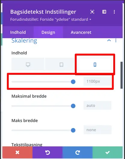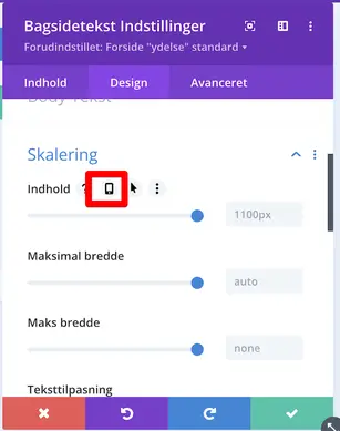 Her kan du så ændre i skalering på telefon, husk at du skal tilføje dette til alle felter hvor du vil ændre på telefon, det hjælper ikke bare at ændre andre ting i telefon-view, så ændrer du også på desktop og tablet.