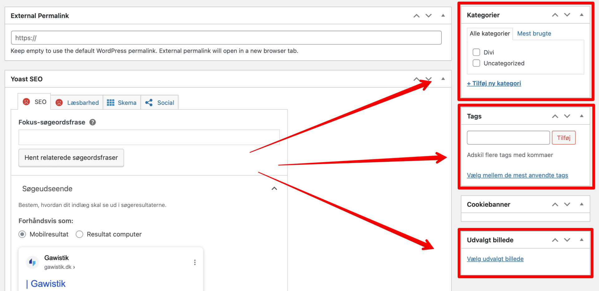 Derefter skal du scrolle lidt ned på siden. Så du kan give dit indlæg en kategori, et tag og et billede. Det vil få det til at se mere professionelt ud.