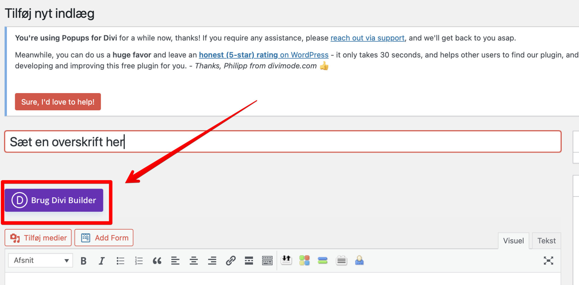 Herefter scroller du tilbage til toppen og trykker “Brug Divi Builder”