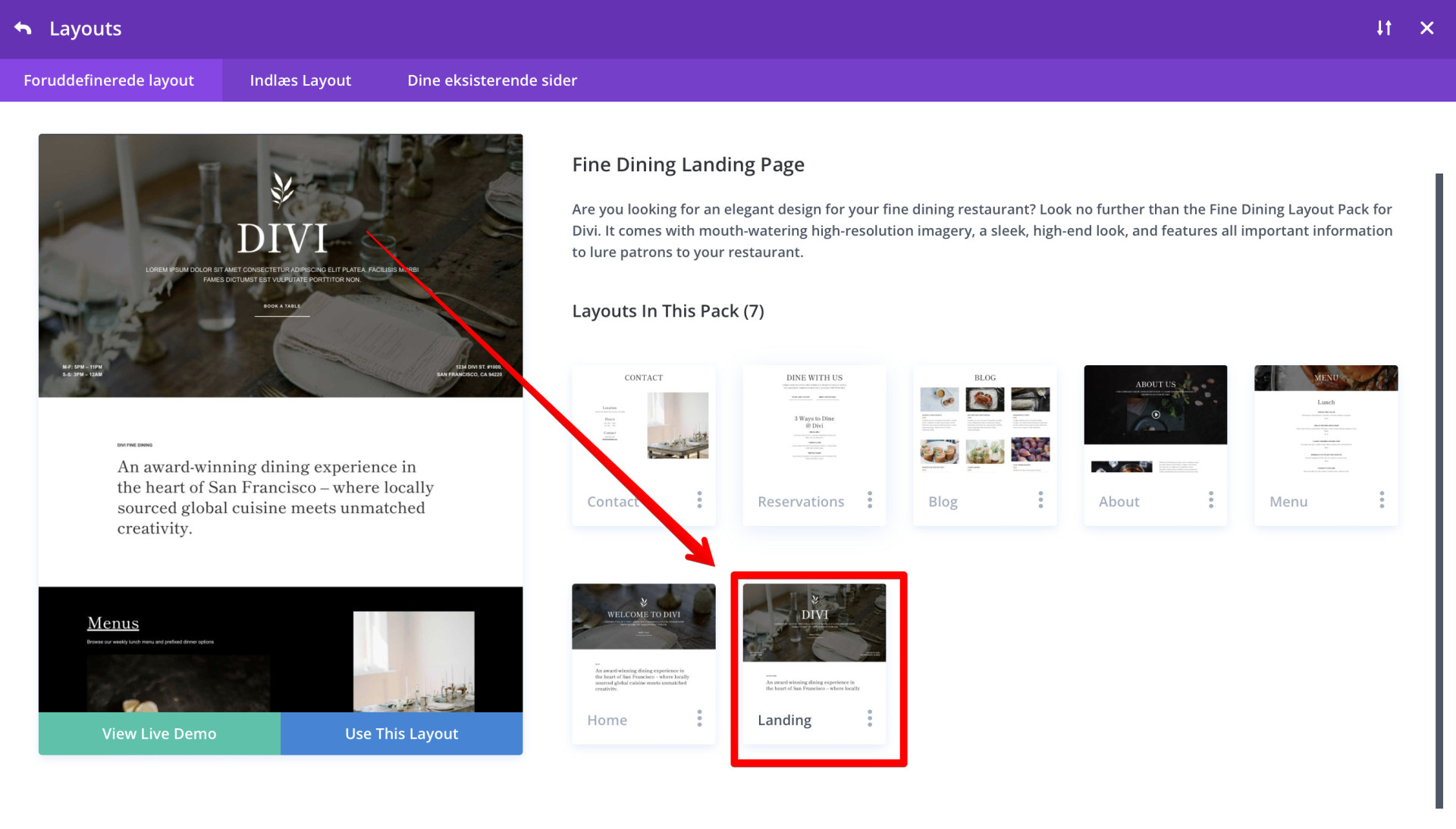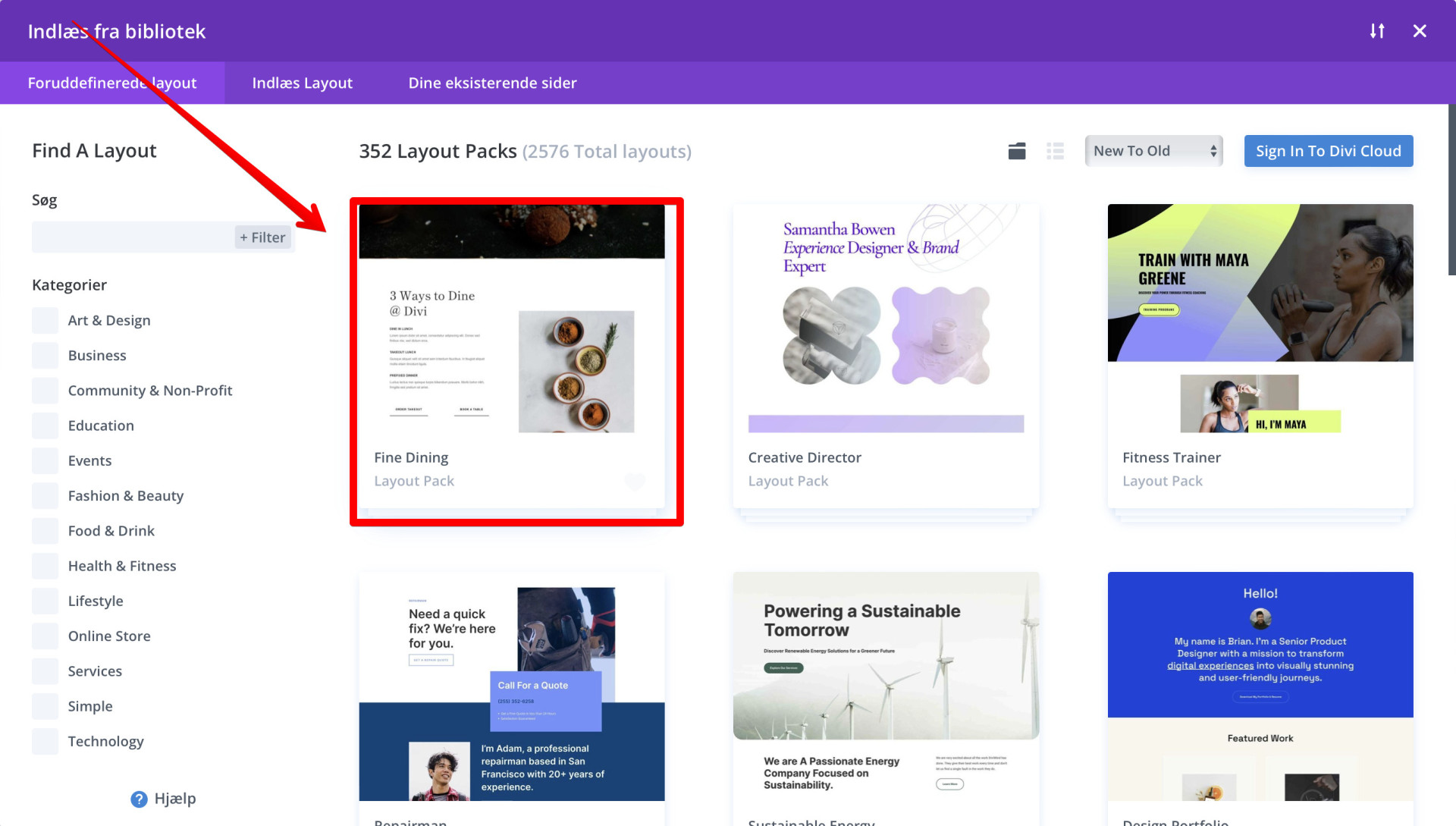 Start med at finde det layout du bedst kan lide, du kan evt. bruge søgefunktionen. I dette eksempel tager vi udgangspunkt i layoutet “Fine Dining”. Når du har fundet dit ønskede layout, skal du klikke på dette.
