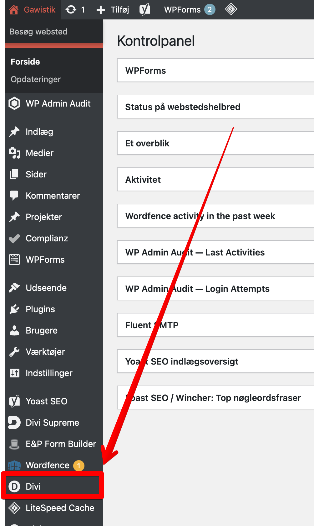 Dette gøres ved at du starter med at gå tilbage til dit divi kontrolpanel. Som gøres ved at klikke oppe i venstre hjørne, se billede: