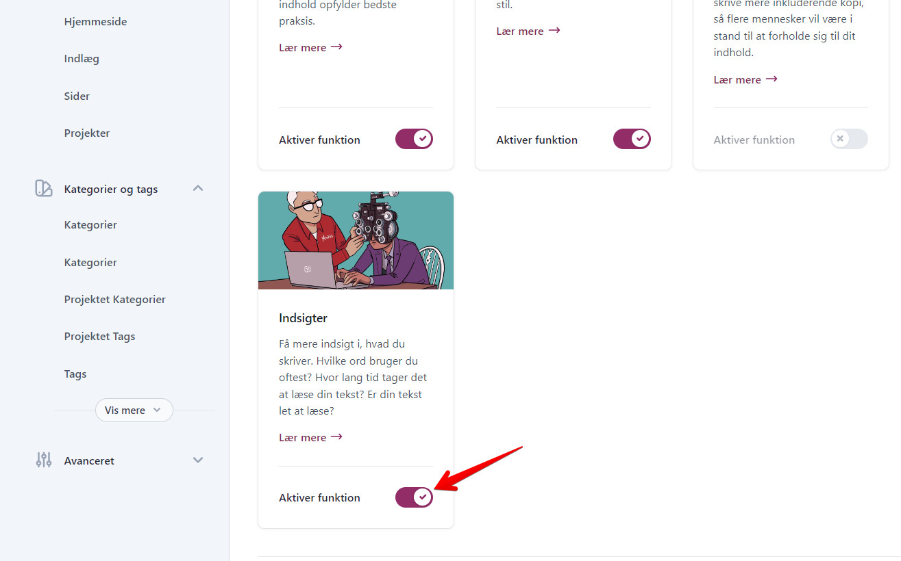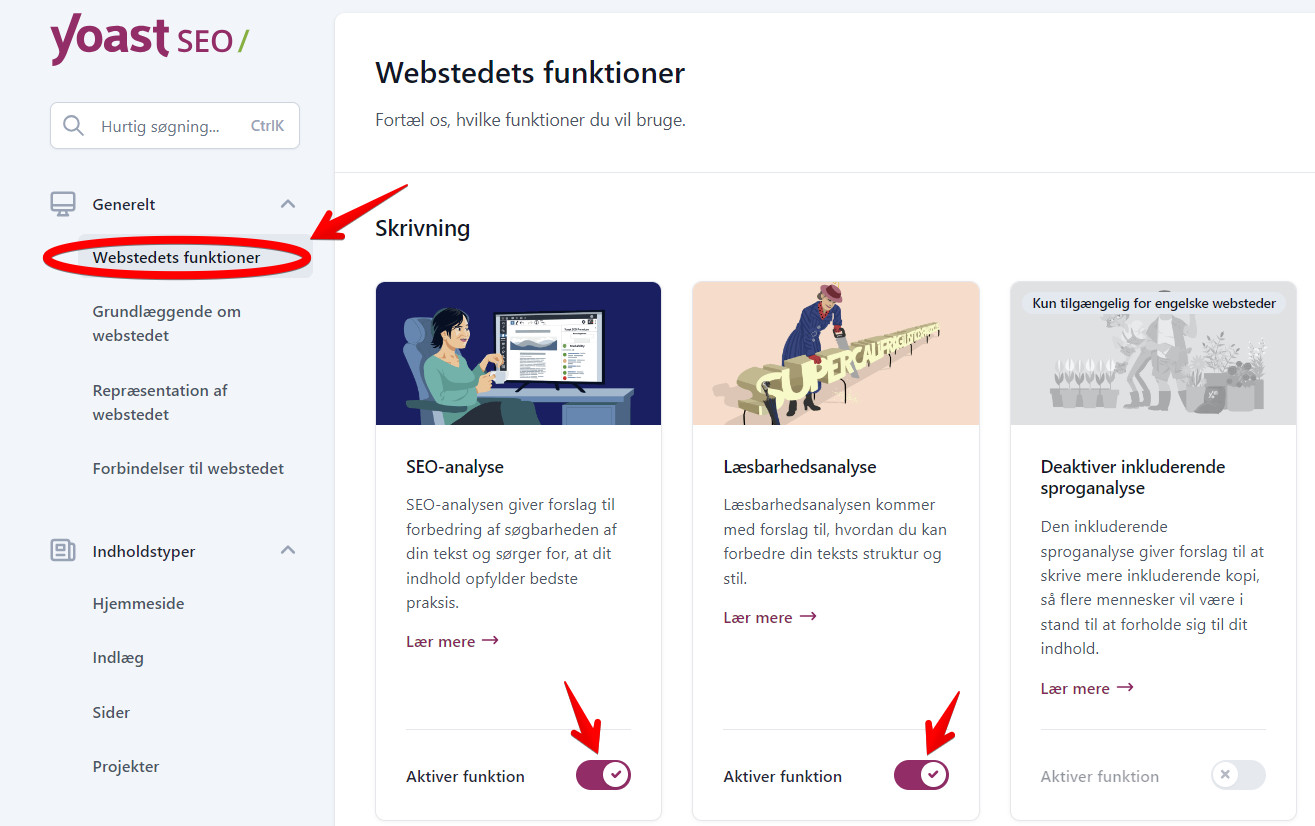 6. Gå under “Webstedets funktioner” og sørg for, at følgende er slået til: “SEO-analyse”, “Læsbarhedsanalyse” og “Indsigter” (*1-2 billeder)