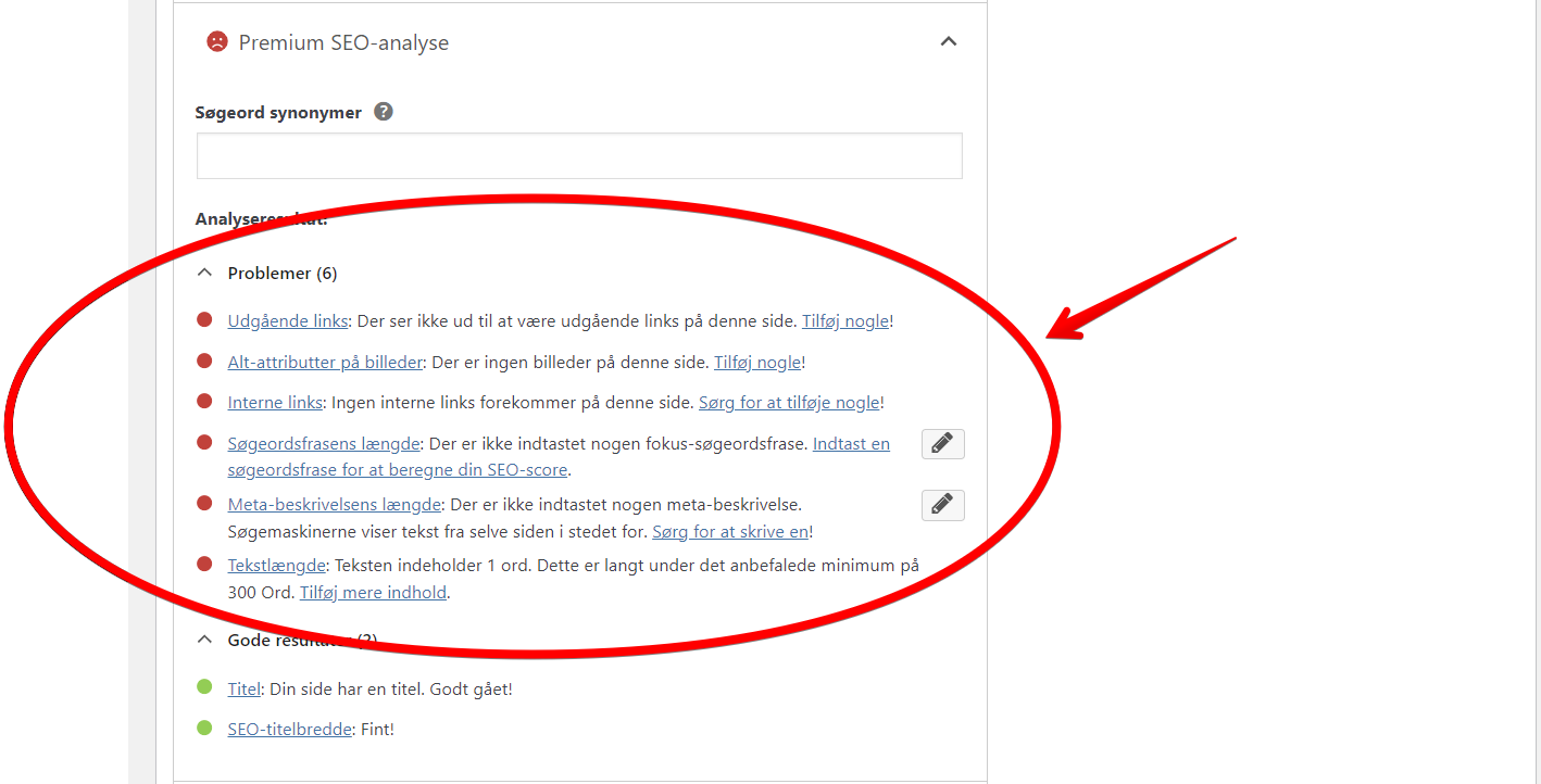 Det som analyseresultater gør er, at den fortæller hvilke ting du kan forbedre på indholdet samt det andet på din hjemmeside. For eksempel siger min, at der ikke er nogle interne links, eller at der ikke er alt-attributre på billeder. På den måde kan du få nemt overblik over, hvad du kan gøre for at optimere din hjemmeside.