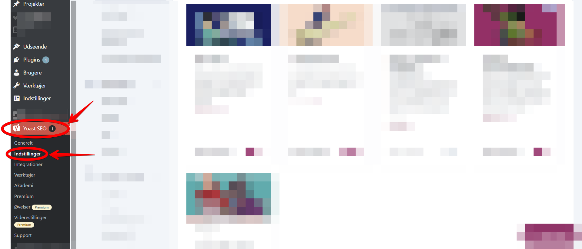 5. Åbn “Yoast SEO” fra dit kontrolpanel, og gå ind på “indstillinger” (*billede)