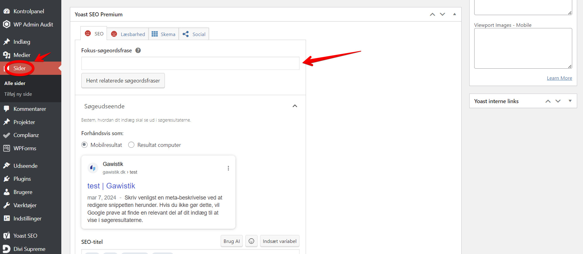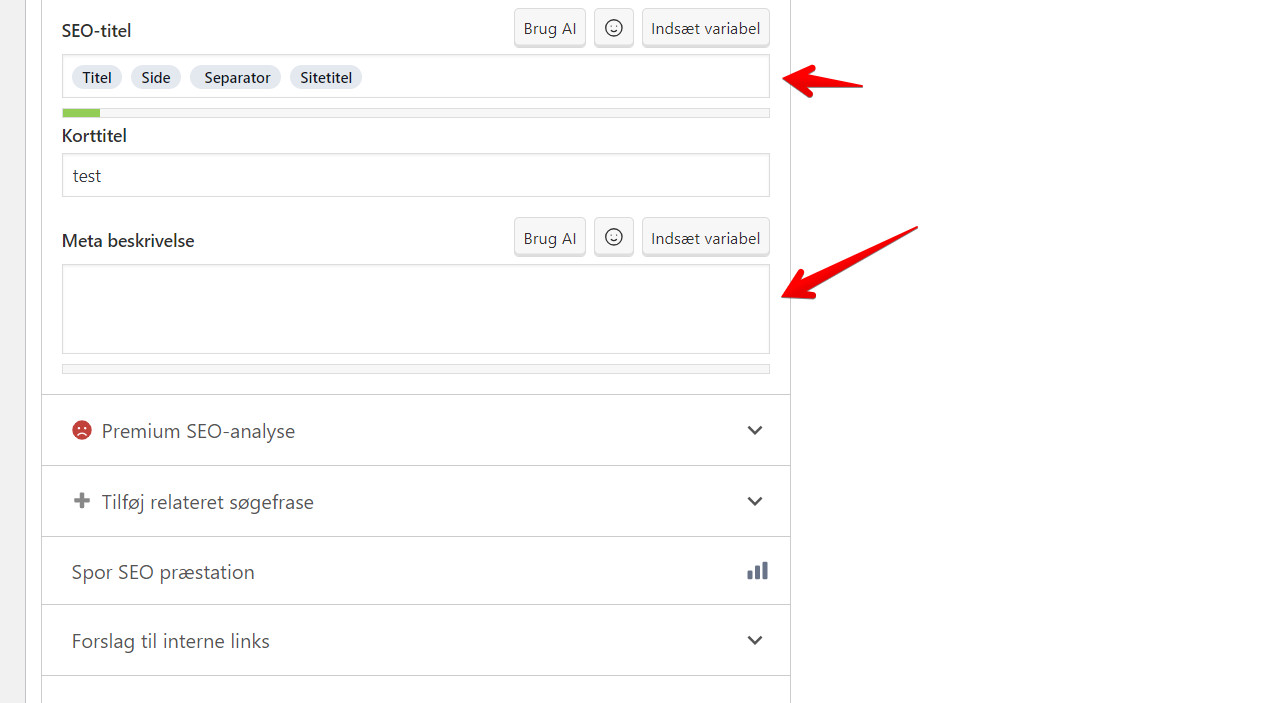 Her skal du udfylde hvordan din side skal fremstå på Google. Det vigtigste her er, at du udfylder “Fokus-søgeordsfrase”. Dette er fordi det er selve emnet, som siden har, fx. “priser” eller “kontakt os”.