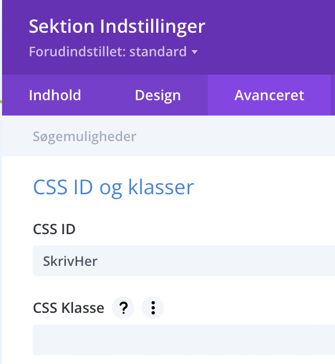 Herfra skal du vælge “Avanceret” i toppen og åbne kategorien “CSS ID og klasser”. Her skriver du hvad du vil kalde den sektion under “CSS ID”. I vores eksempel går vi med “SkrivHer”.