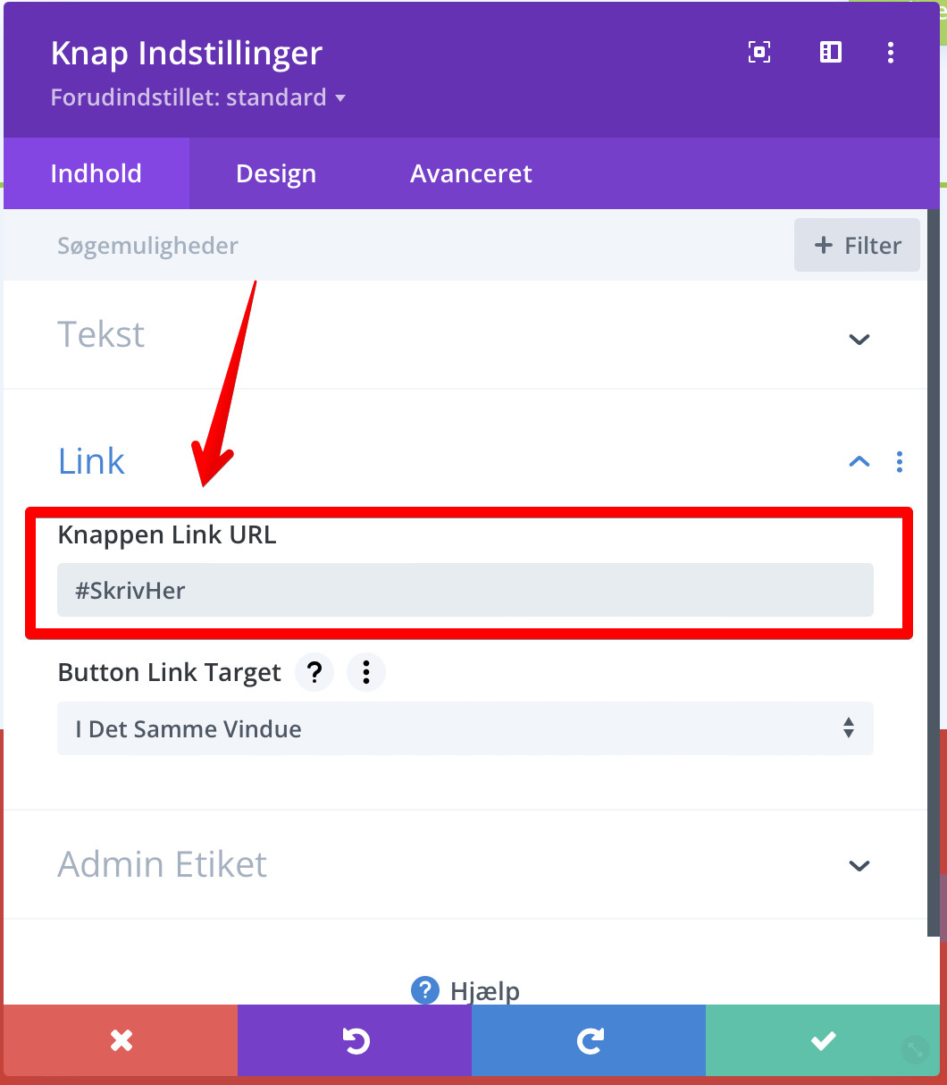 Her skal du blive under “Indhold” og finde kategorien “Link”, her indsætter du et “#CSS_ID”. Så hvis du har valgt CSS id til at være “Skriv her”, så skriver du i feltet “#SkrivHer”.