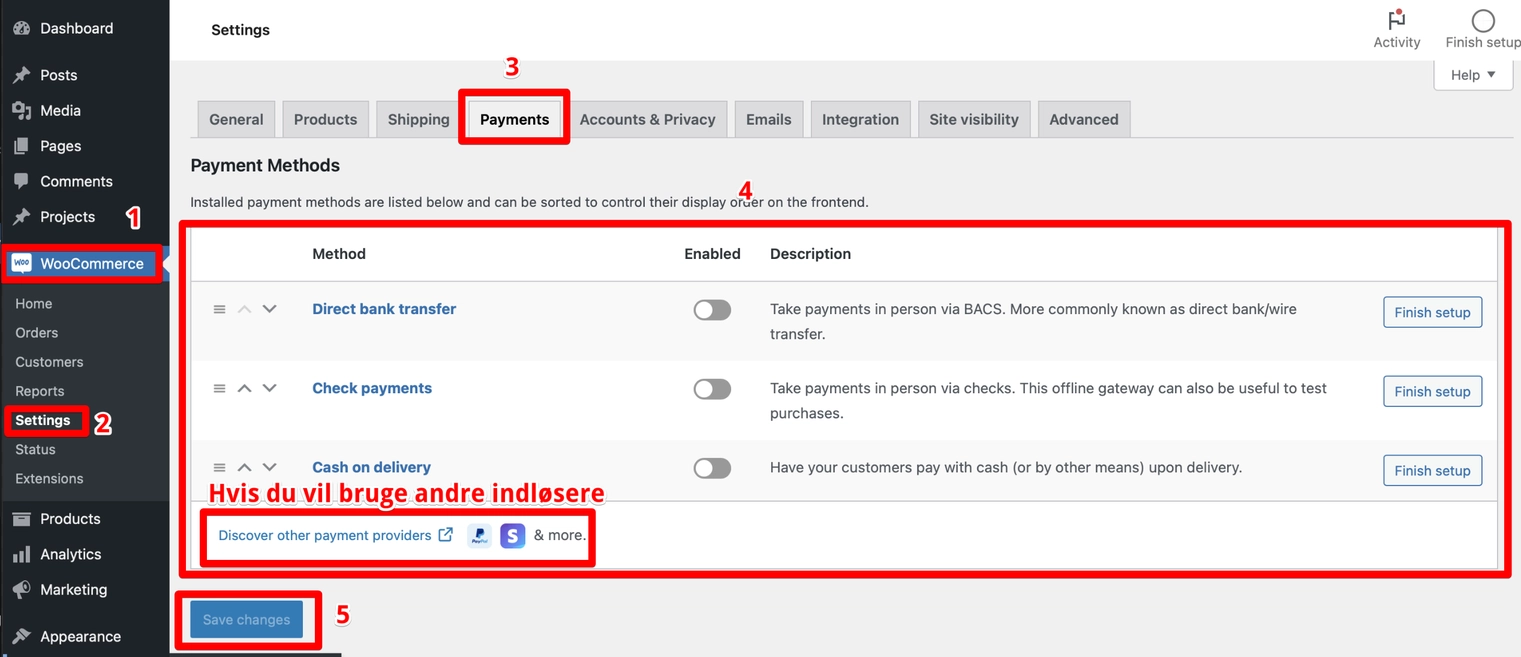 - Gå til WooCommerce > Indstillinger > Betalinger.