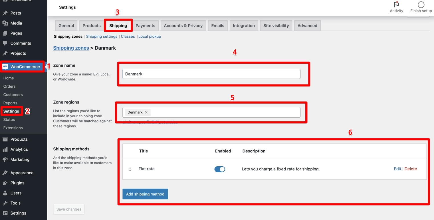 - Gå til WooCommerce > Indstillinger > Forsendelse.