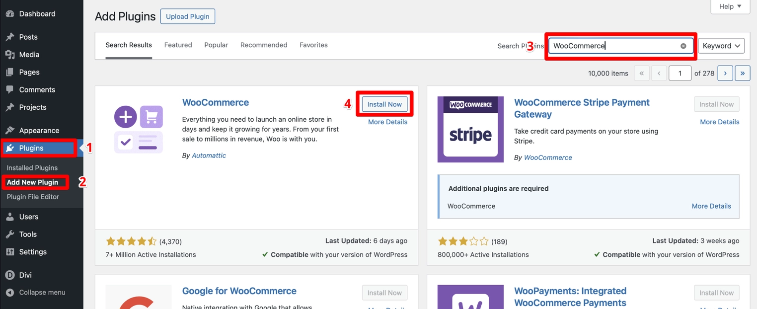 - Søg efter “WooCommerce” og klik på Installer nu.