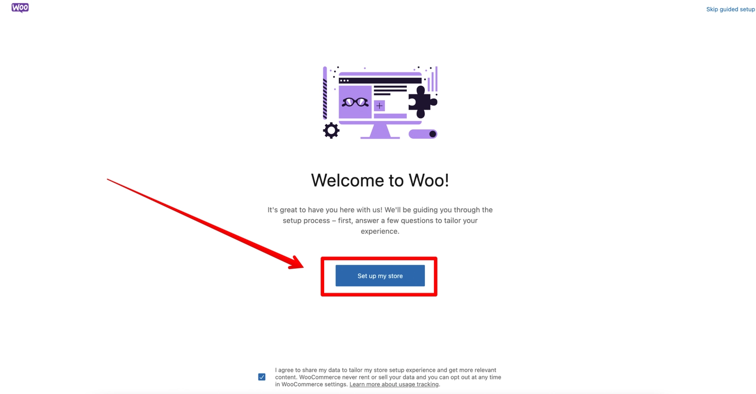 Når WooCommerce er aktiveret, vil du blive guidet gennem en opsætningsguide, hvor du kan konfigurere grundlæggende indstillinger.