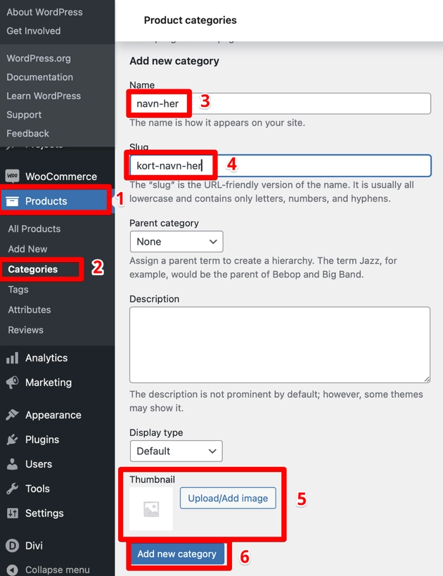 - Gå til Produkter > Kategorier i WordPress-dashboardet.