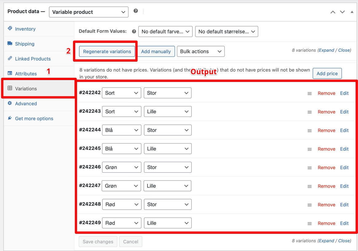 - Angiv priser og lagerbeholdning for hver variation.